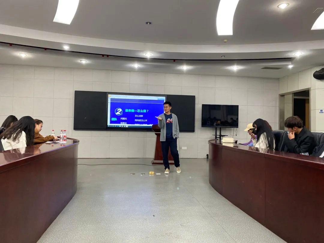 在刘远航同学介绍完比赛流程后,朱雨同学对比赛进行中的细节做了补充。朱雨同学建议道,技术新最能够支撑项目的认可度,市场上营销方式的创新在大赛中捉襟见肘,很难走到最后。而“公益项目要落实”是朱雨同学对此类参赛组的特别提醒。最后,朱雨同学详细阐述了申报书与ppt制作中的注意点,此类宝贵经验足以让同学们受益良多,反复思忖。