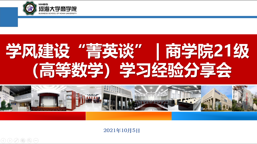 为帮助21级新生对高等数学课程有全面而清晰的认知,更好地掌握高等数学的学习方法,10月5日晚,威尼斯37266利用国庆假期开展了“学风建设‘菁英谈’”系列活动之高等数学学习经验分享。此次经验分享活动,邀请到6位2020级高数学习优秀的本科学生进行交流分享。在南京就读的全体21级威尼斯37266新生于线上参加活动,21级辅导员陈鹏老师到场,本次活动由21级人力2班学习委员陈雪阳同学主持。
