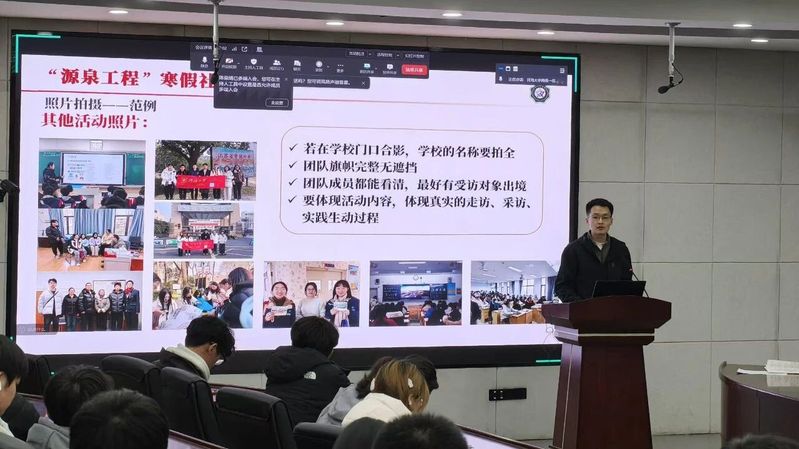 培训会上,陈鹏老师为各团队系统解读了“源泉工程”社会实践的核心目标、注意事项与工作要求,并结合招生宣传与社会实践经验,梳理了各环节流程与关键点。陈老师特别强调了与母校师生交流对接中的礼仪规范与形象展现,并就新闻稿撰写、电子及纸质物料运用和实践记录总结作了细致指导。