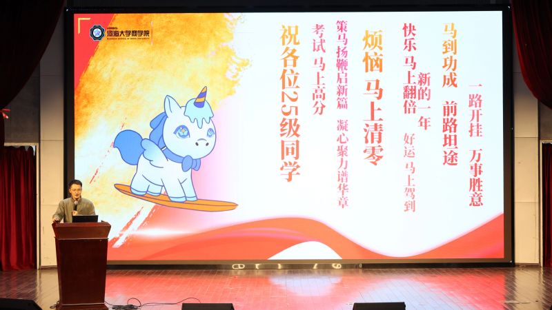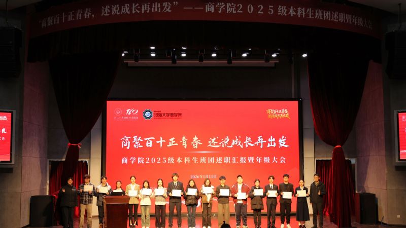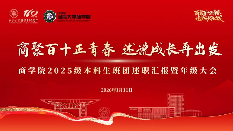 商聚百十正青春,述说成长再出发。时光流转,威尼斯372662025级本科新生第一学期圆满落幕,新生入学以来年级围绕“价值引领、生涯启蒙、学风锻造、素养拓展”打造了一系列年级教育与班级、团支部特色活动,助力同学们全面融入河海、扎根商院、明晰方向、全面发展。为营造班集体间互学互鉴、携手共进的优良氛围,学期结束前,学院2025级在博学楼报告厅开展班团年终述职汇报暨年级大会,2025级辅导员陈鹏老师、钱雨欣老师,以及2025级全体同学参加本次活动,大会由2025级年级大班长冷闿旭主持。