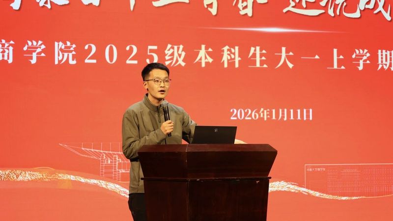 汇报结束后,年级大会正式拉开帷幕。陈鹏老师肯定了全体同学在本学期新生教育活动中展现出的积极风貌,随后立足学习规划与教育管理两大核心,为同学们明确了下一阶段成长方向。学风建设方面,陈老师对比剖析了大学与高中学习模式的差异,结合期中考试系统分析了各班学业发展情况,着重强调了大一学年夯实学业基础的重要性,呼吁全体同学树立优良学风,建立良性互助的学习氛围。日常管理方面,陈老师系统讲解了日常要求、PU学分、请销假制度等基本规范,同时对寒假社会实践开展、假期安全教育等工作提出具体说明,并祝福全体同学新的一年实干笃行、在大学乃至更长的人生道路上行稳致远。